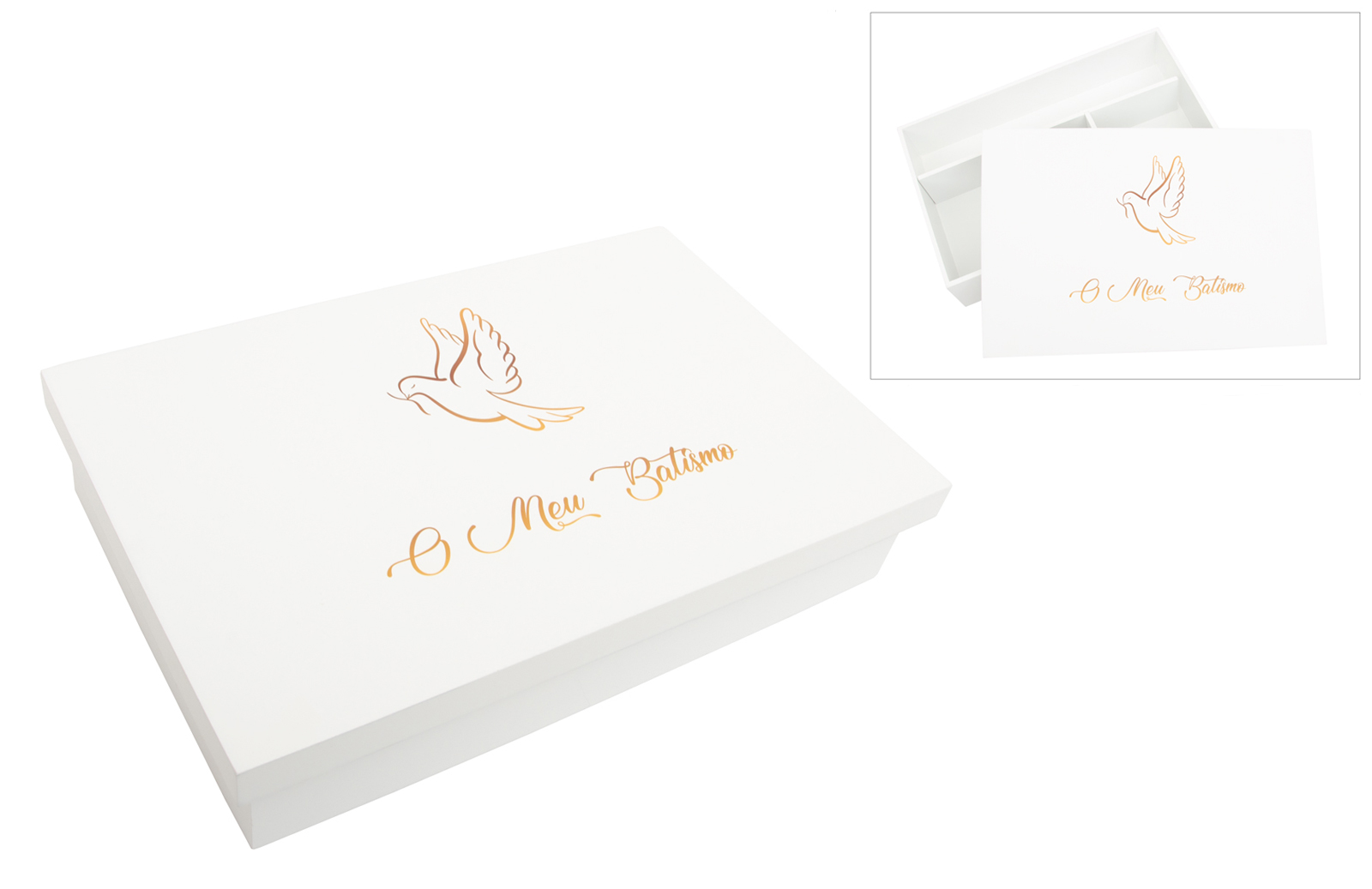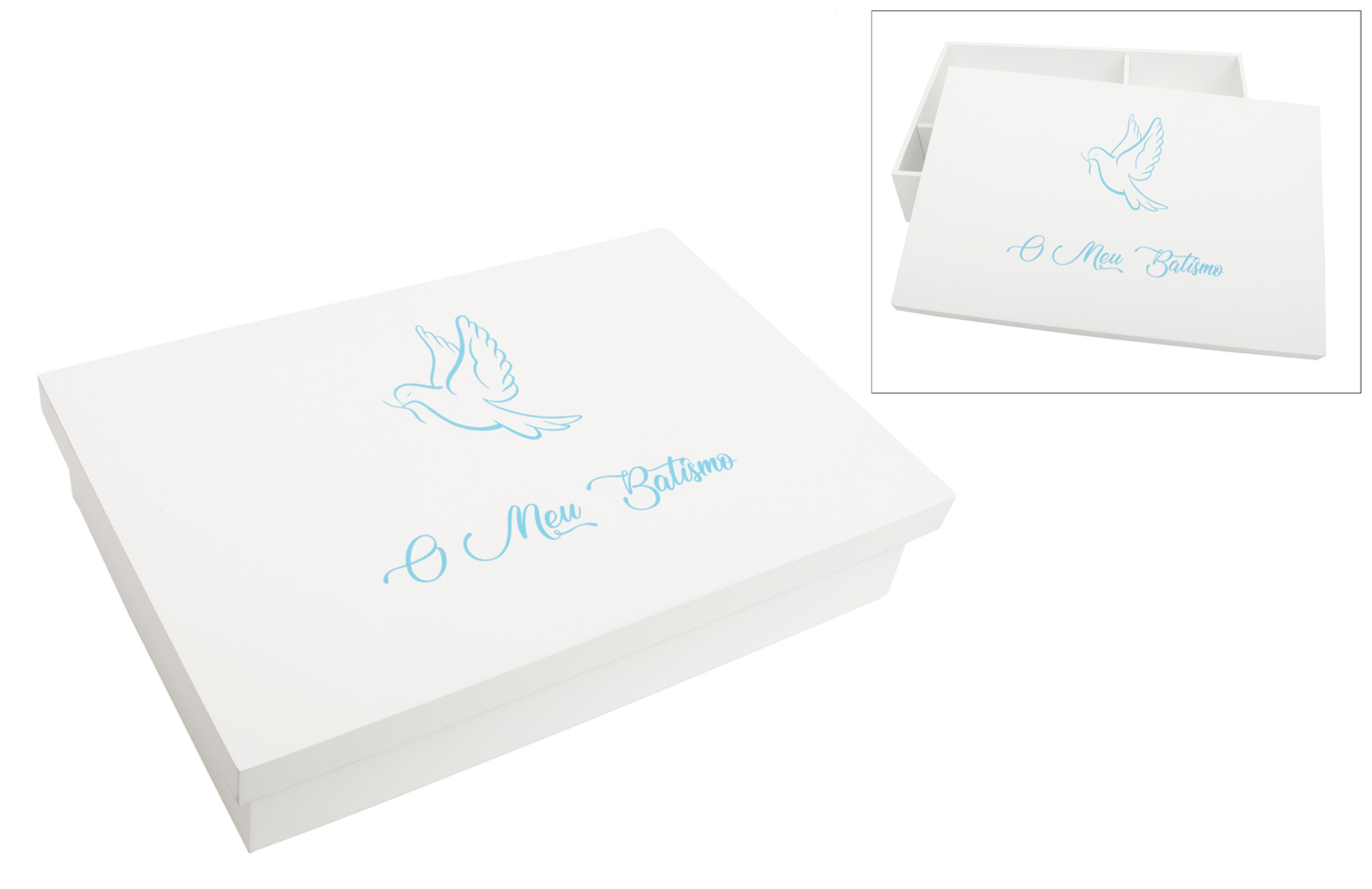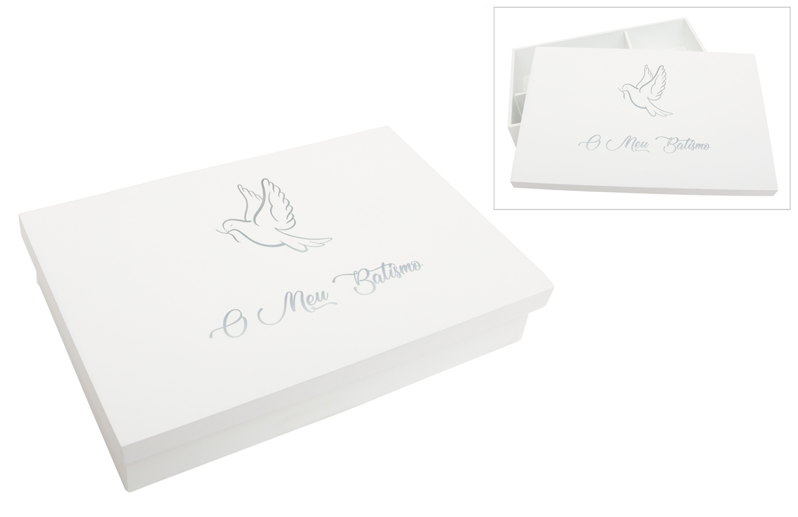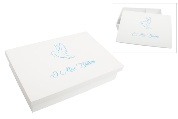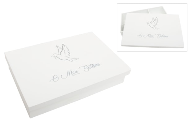 !!! ATENCIÓN !!! Este producto incluye texto en portugués. Si prefieres la versión en español, solicita información o envíanos un correo electrónico para gestionar tu pedido personalizado. Caja de madera lacada, con divisores interiores para guardar la vela, la toalla y la concha. La tapa está decorada con una delicada ilustración de una paloma, aplicada mediante impresión UV, lo que garantiza colores vivos, detalles nítidos y una alta durabilidad. Incluye la frase "Mi Bautizo", también impresa en UV. Una pieza práctica y decorativa, perfecta para conmemorar este momento único. Disponible en varios colores.