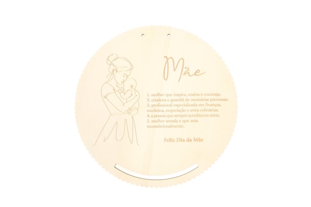 Este caça-sonhos em madeira, com 25cm de diâmetro, é a base perfeita para quem procura oferecer um presente artesanal e cheio de significado. O design apresenta uma gravação detalhada de mãe e filho acompanhada pela definição da palavra "Mãe", criando uma peça profundamente emocional que celebra o amor incondicional. Equipado com uma ranhura inferior estratégica, permite que cada cliente personalize o artigo com trabalhos de macramé, rendas ou outros materiais, transformando-o numa obra de arte única. É o produto ideal para o Dia da Mãe, unindo a beleza da gravação de precisão à liberdade criativa do feito à mão.