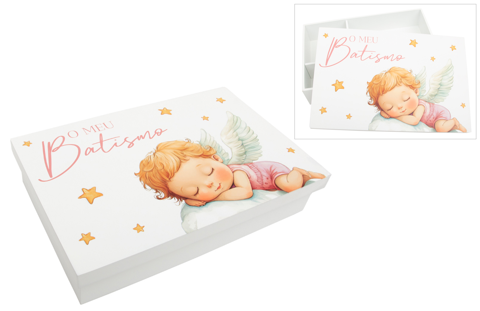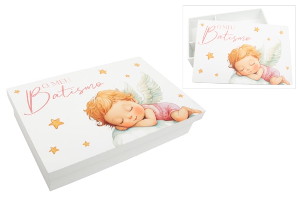 Caixa de madeira lacada, com divisórias interiores para guardar a vela, a toalha e a concha. A tampa apresenta uma doce ilustração de um anjinho a dormir, complementada pela frase "O meu Batismo" em impressão UV de alta qualidade. Uma peça prática e decorativa, perfeita para marcar este momento único.