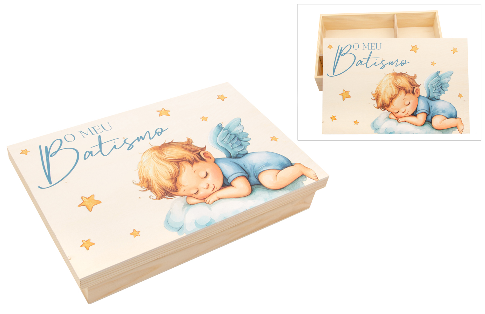 Caixa de madeira lacada, com divisórias interiores para guardar a vela, a toalha e a concha. A tampa apresenta uma doce ilustração de um anjinho a dormir, complementada pela frase "O meu Batismo" em impressão UV de alta qualidade. Uma peça prática e decorativa, perfeita para marcar este momento único.