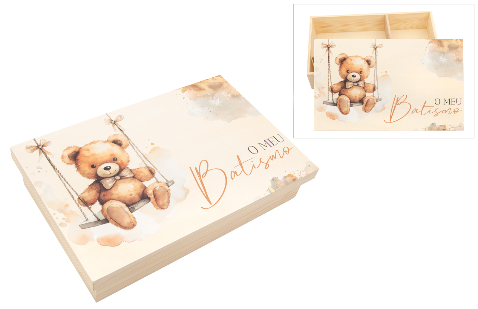 Caixa de madeira lacada, com divisórias interiores para guardar a vela, a toalha e a concha. A tampa é decorada com uma delicada ilustração de um urso no baloiço, aplicada através de impressão UV, garantindo cores vivas, detalhes nítidos e alta durabilidade. Inclui a frase "O meu Batismo", também impressa em UV.