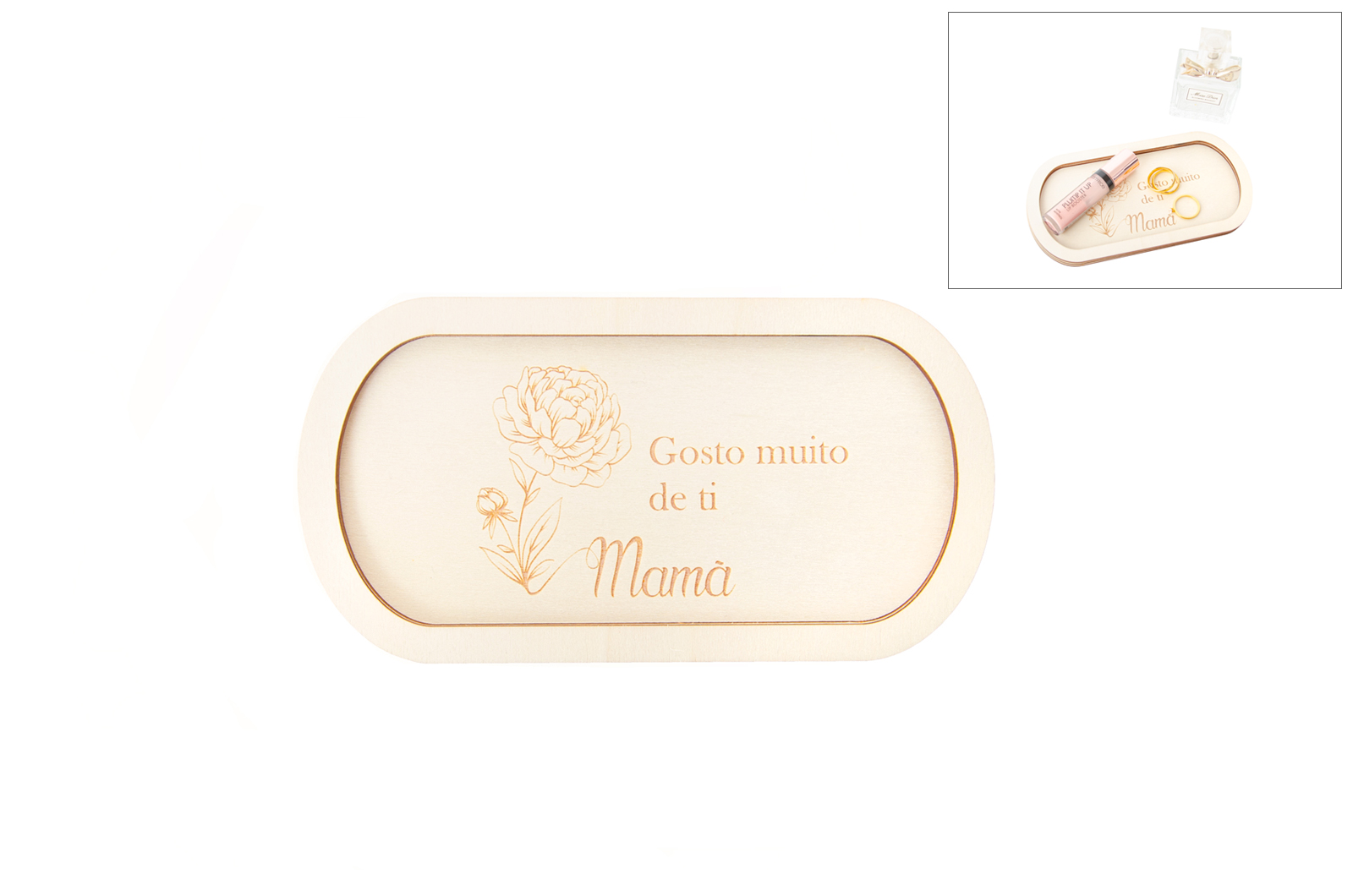 Dê um lugar especial às pequenas coisas do dia a dia com este organizador de bolso em madeira de choupo. Esta peça apresenta a gravação delicada de uma flor e a mensagem terna: "Gosto muito de ti, Mamã". É o presente perfeito para o Dia da Mãe ou para qualquer ocasião em que queira recordar-lhe o quanto ela é amada. Ideal para colocar na mesa de cabeceira ou na entrada da casa, servindo como suporte para joias, chaves ou pequenos acessórios.