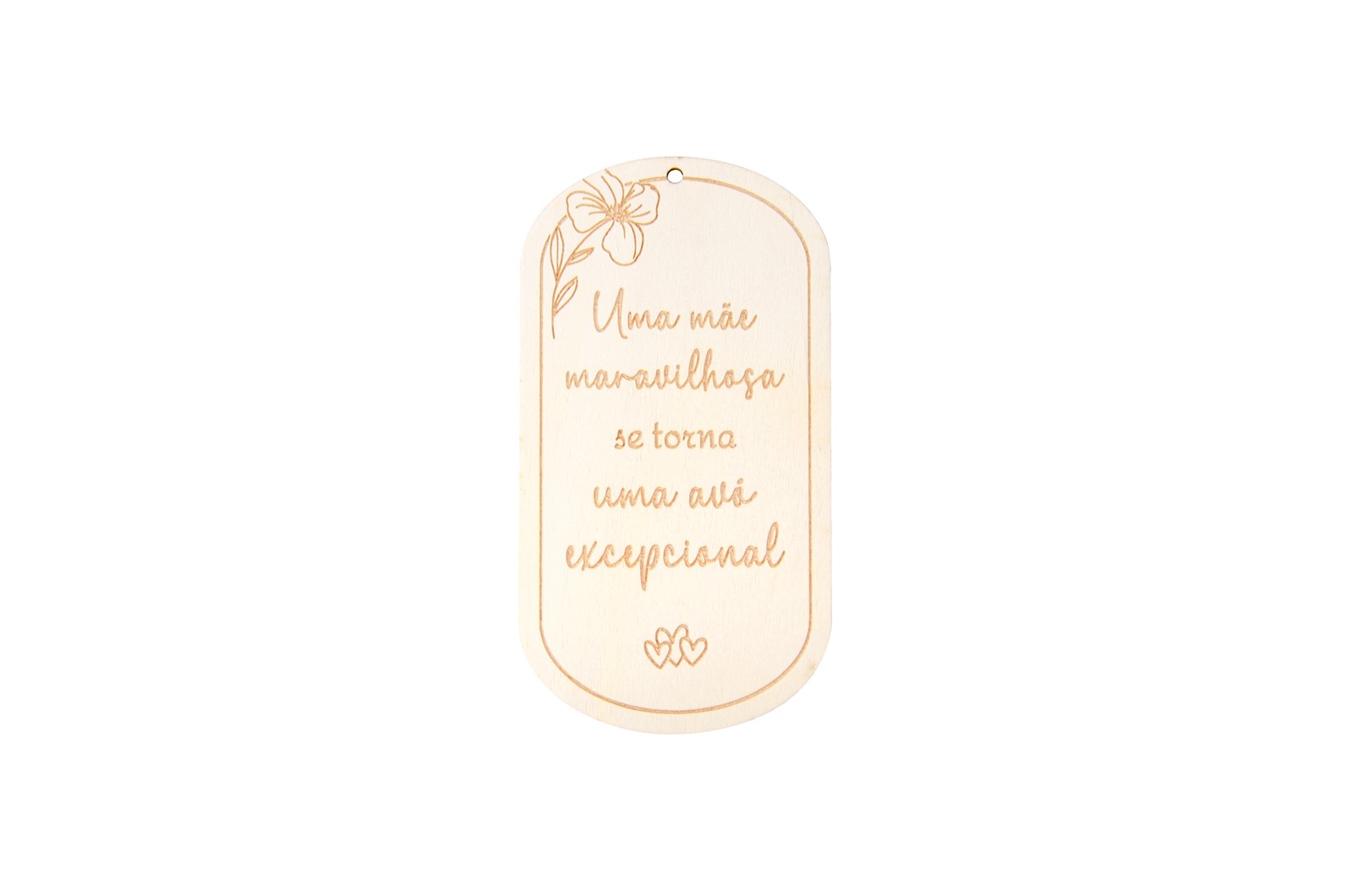 Celebre a doçura de quem é mãe e avó com esta placa delicada em madeira de choupo. Apresenta a gravação de uma flor e a frase: "Uma mãe maravilhosa se torna uma avó excepcional."Com um acabamento natural e furo superior para pendurar, é o detalhe perfeito para personalizar presentes ou decorar um cantinho especial com todo o afeto. Dimensões 6.3X12X0.3cm.