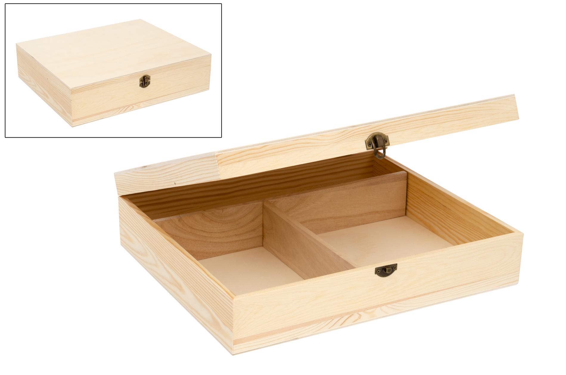 Box with removable partition. It has hinges and clasp. Can be used to store the souvenirs of the baptized.
