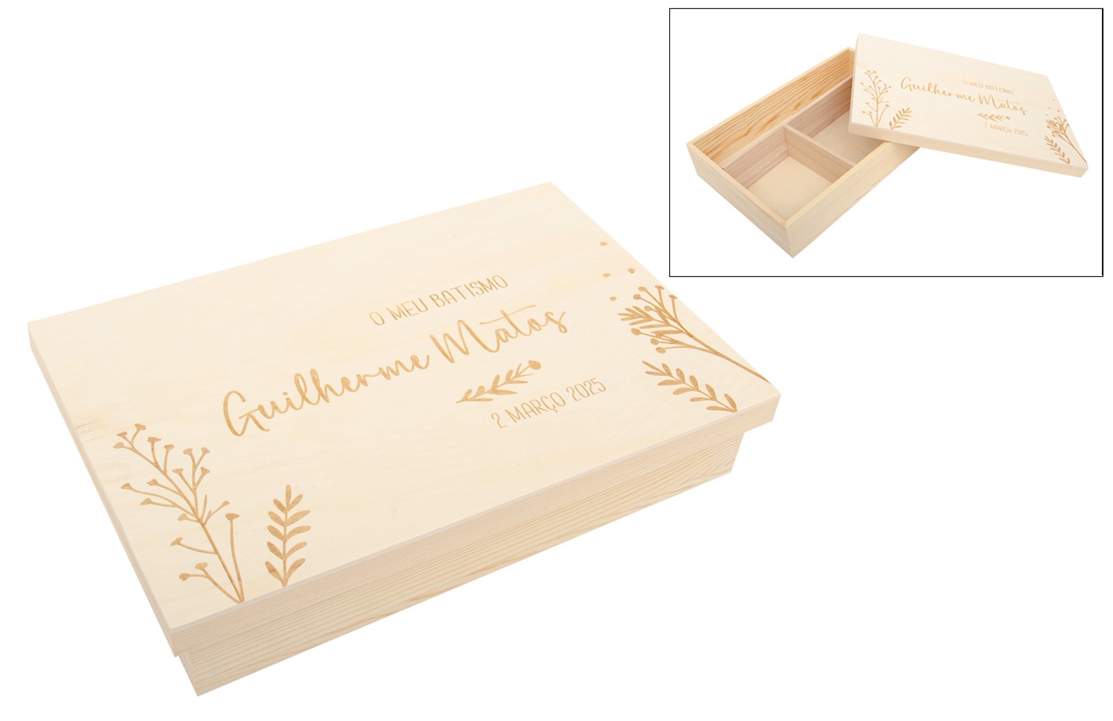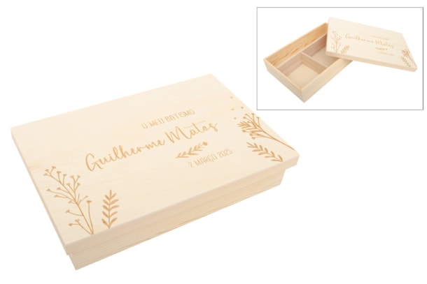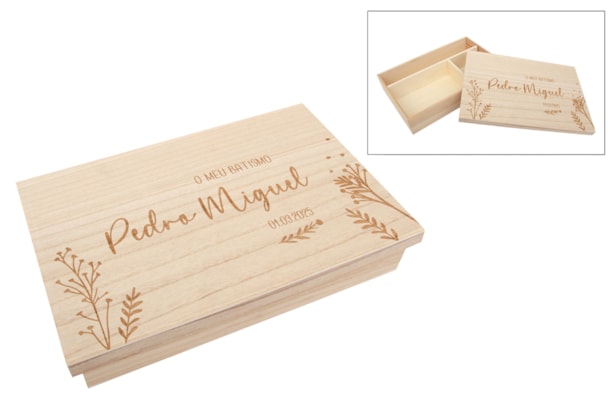 Wooden box with removable dividers. The lid is slot-fitting. It can be used to store baptism keepsakes. The name and date on the lid are customizable.