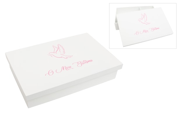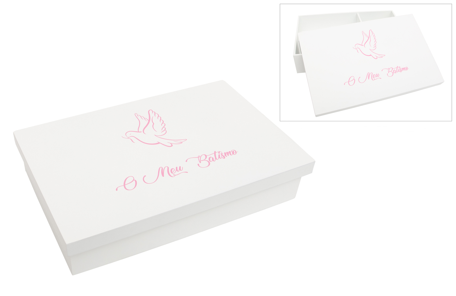 Lacquered wooden box with interior compartments to store the candle, the towel, and the shell. The lid is decorated with a delicate illustration of a dove, applied through UV printing, ensuring vibrant colors, sharp details, and high durability. It includes the phrase "My Baptism," also UV printed. A practical and decorative piece, perfect for commemorating this unique moment. Available in multiple colors.