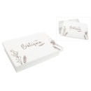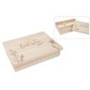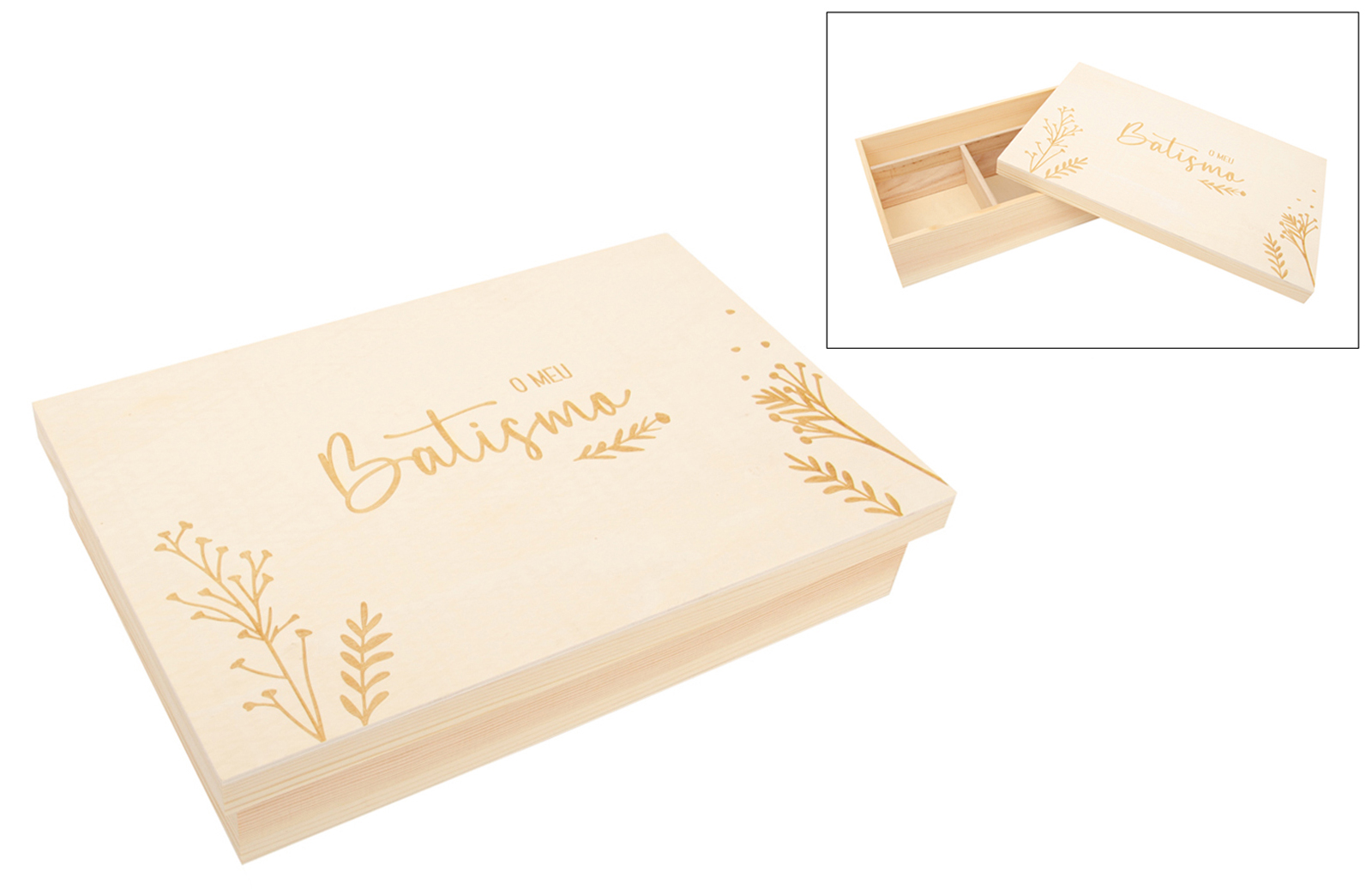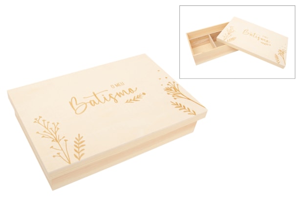 Caja de madera con compartimentos para guardar los elementos del Bautismo, como vela, toalla y concha. En la tapa de la caja se graba con láser 'O MEU BATISMO'. Para complementar la decoración, la caja también está grabada con follaje. ATENCIÓN: Si desea esta caja con la grabación en su idioma, haga el pedido en las observaciones del pedido. Si no lo hace, recibirá la caja tal como se muestra en la imagen.