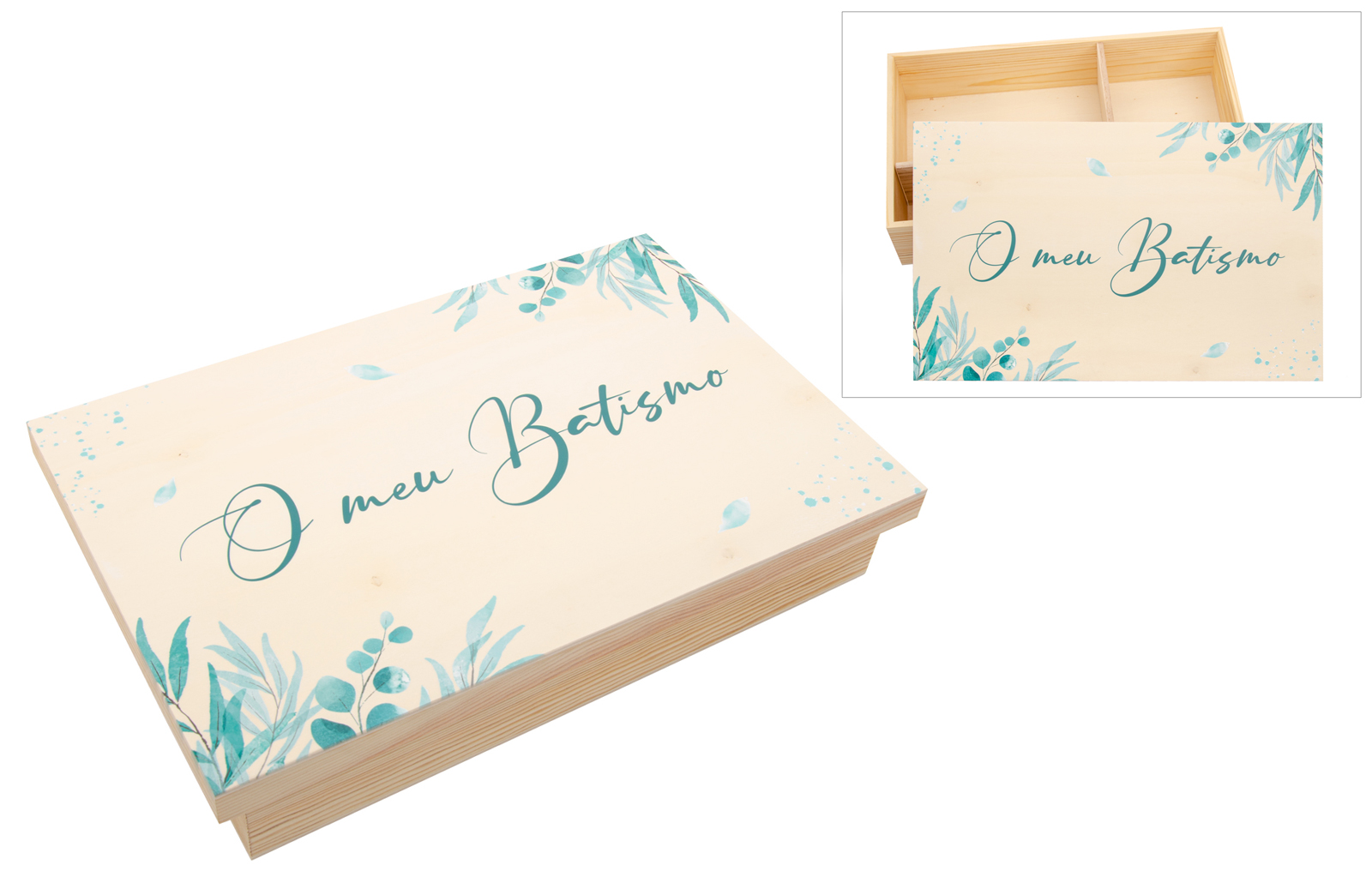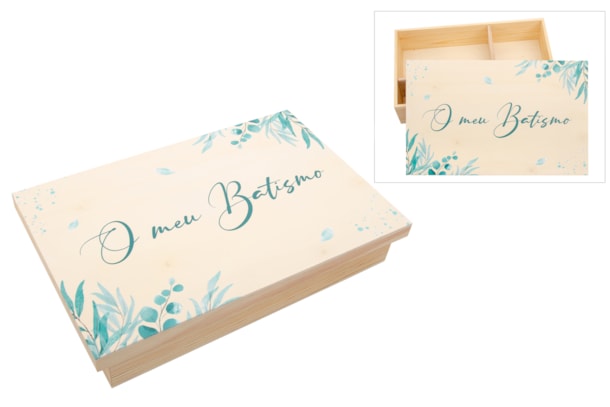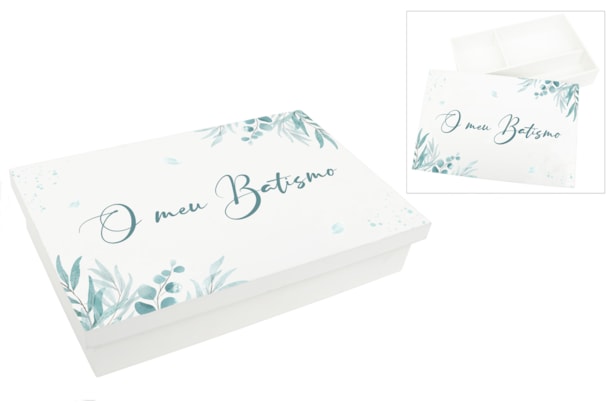 !!! ATENCIÓN !!! Este producto incluye texto en portugués. Si prefieres la versión en español, solicitEsta sofisticada caja de bautizo está lacada en blanco, ofreciendo un acabado elegante e intemporal. La grabación en impresión UV presenta delicados detalles de follaje en tonos verdes y azules, creando un diseño fresco y armonioso. Perfecta para guardar los recuerdos más importantes del bautizo, como la vela, la concha u otros artículos especiales de este día tan significativo. Una pieza práctica y decorativa que eterniza este momento único.