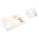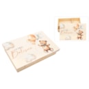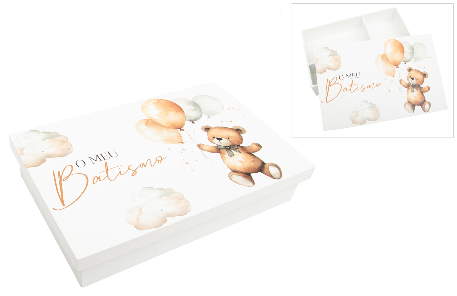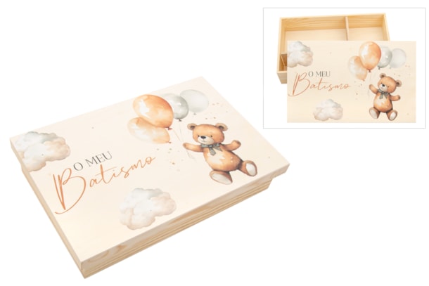 !!! ATENCIÓN !!! Este producto incluye texto en portugués. Si prefieres la versión en español, solicita información o envíanos un correo electrónico para gestionar tu pedido personalizado. Caja de madera lacada, con divisores interiores para guardar la vela, la toalla y la concha. La tapa está decorada con una delicada ilustración de un oso con globos, aplicada mediante impresión UV, que garantiza colores vivos, detalles nítidos y alta durabilidad. Incluye la frase "Mi Bautizo", también impresa en UV. Una pieza práctica y decorativa, perfecta para marcar este momento único.