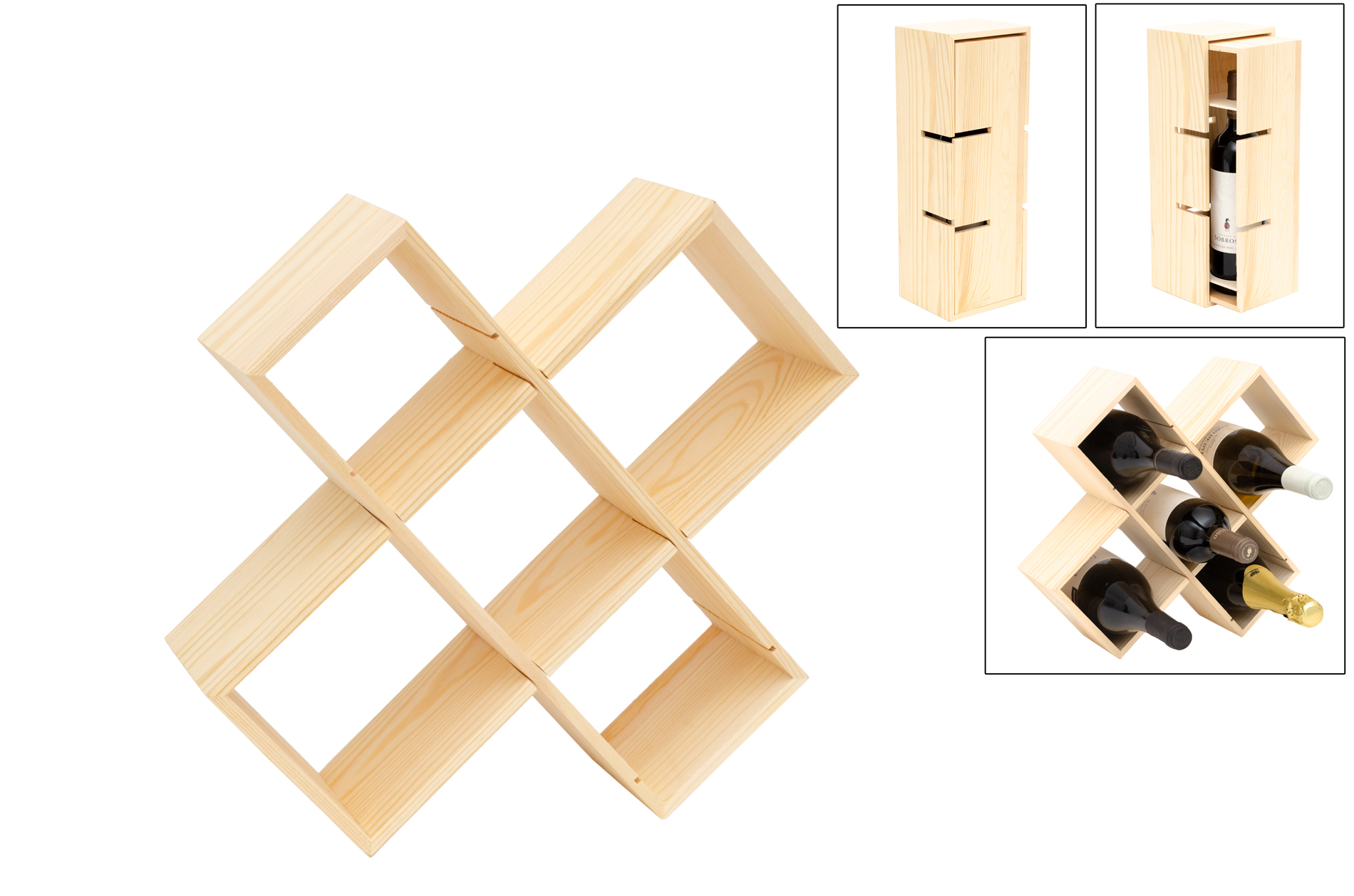 Esta inovadora caixa para garrafa oferece uma funcionalidade dupla: além de proteger uma garrafa de vinho ou outra bebida durante o transporte ou oferta, transforma-se facilmente numa elegante garrafeira. Ideal para expor até 5 garrafas, o seu design modular e em madeira natural proporciona uma solução prática e decorativa. Versátil e compacta, esta peça é perfeita para os amantes de vinho que procuram funcionalidade e estilo numa só peça. A madeira pode ser personalizada ao gosto, integrando-se em qualquer ambiente.