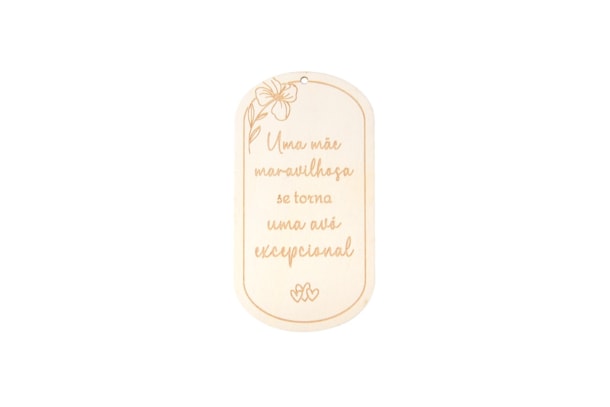 Celebre a doçura de quem é mãe e avó com esta placa delicada em madeira de choupo. Apresenta a gravação de uma flor e a frase: "Uma mãe maravilhosa se torna uma avó excepcional."Com um acabamento natural e furo superior para pendurar, é o detalhe perfeito para personalizar presentes ou decorar um cantinho especial com todo o afeto. Dimensões 6.3X12X0.3cm.